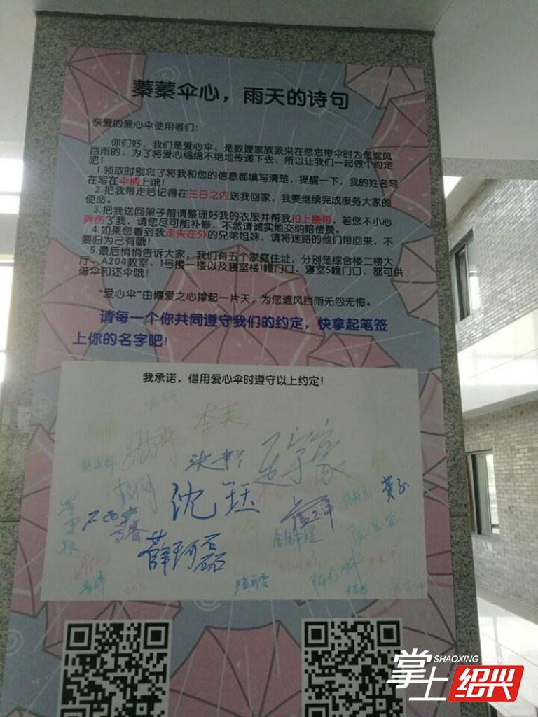 目前,“爱心共享伞”已遍布学校教学、办公、宿舍三大区域的10多幢大楼。爱心伞的设立方便了大家,也传递了爱心。“从2年前爱心伞投放开始,至今没有丢失一把伞。学校师生都在体验到便利的同时,将这份便利和爱心传递下去。”该校数理信息学院党委副书记史正东说。