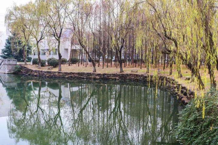 河西校区的小树林。炎炎夏日它们撑开绿荫伞为学子遮阳;凛凛冬日,它们露出光秃枝干,为在风中寻食的鸟儿提供休憩场所。沿岸生长的垂柳,早早发出了嫩芽。偶有几只寒雀穿梭其间,与柳条共舞,同时打破湖面的沉默。