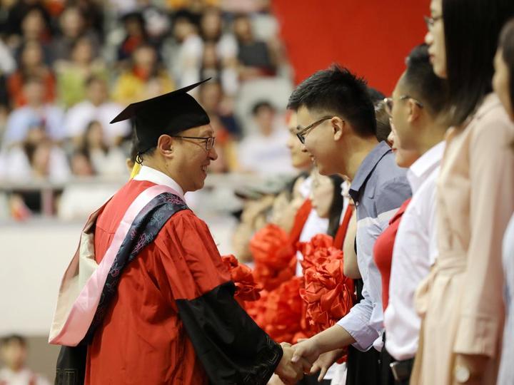 “栀子飘香,骊歌唱响。”6月13日上午,开元(中国)2019届学生毕业典礼在河西校区体育馆隆重举行,学校对全体毕业生送上祝贺和祝福。学校第一届研究生学历留学生的10余位亲友也从大洋彼岸来到文理共同见证这一重要时刻。校党委书记汪俊昌为各方面取得卓越成绩的毕业生代表佩戴大红花。毕业典礼在雄壮的国歌声中开始。典礼以“爱国爱校•励志力行”为主题,分为不负韶华、青春感恩、逐梦起航三个篇章,融入了“感恩、青春、珍藏、奋斗”等元素。