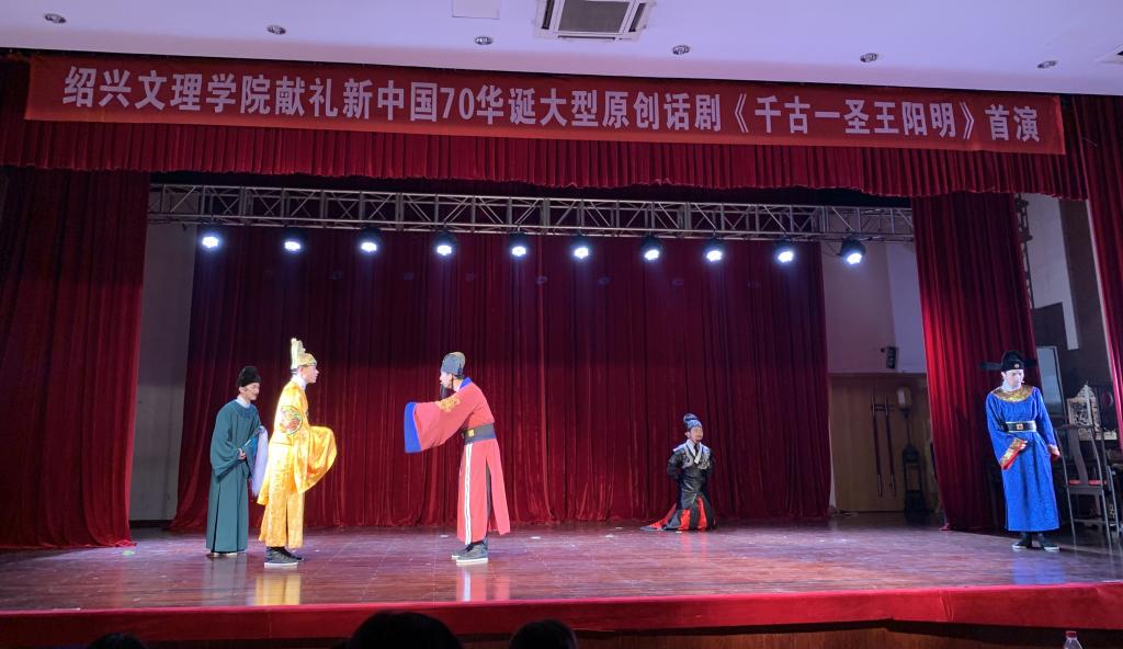 《千古一圣王阳明》由校团委、人文学院主办,党委宣传部、党委学工部、艺术学院协办。该剧聚焦王阳明立志成圣的心路历程,演绎了他从一个狂狷少年成长为心学圣人的一生,一方面对其传奇人生和圣人风采进行了形象展示,另一方面又对他“心即理”“知行合一”“致良知”的心学思想进行了艺术阐释。据悉,为了让绍兴优质文化资源“活起来”,早在去年年底,学校便筹划由今天剧社打造该剧。在指导老师的带领下,剧社还与王阳明研究专家进行交流探讨,考察探寻阳明故居、阳明洞天和王阳明墓等阳明文化遗迹。经过大半年的筹划准备和紧张创排,在今天剧社成立十周年之际正式首演。