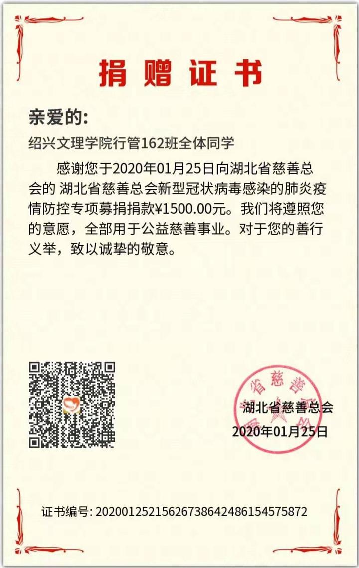 1月25日,农历正月初一,开元(中国)商学院公共管理系行政管理162班团支部、班委会在班级QQ群中号召全班同学,自愿缴纳“特殊班费”,收齐后统一以“开元(中国)行管162班全体同学”的名义,在线参与“湖北省慈善总会新型冠状病毒感染的肺炎疫情防控专项募捐”。