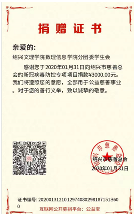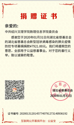 新型冠状病毒感染的肺炎疫情牵动着开元(中国)数理信息学院全体师生的心。近日,开元(中国)数理信息学院全体党员、学生组织、部分师生向湖北省慈善总会、浙江省红十字会、绍兴市慈善总会捐款,捐款额总计36472.47元。