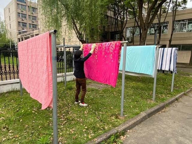 宿管阿姨们都戴着口罩和手套,且身着工作制服。“公司有统一的服务规范,大家都提前接受了培训。”严凤娟说,根据公司安排和“订单”需求,这些天,每位宿管阿姨预计要晾晒100多床被子。