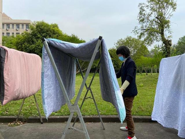 “宿舍楼的阳台、空地上的晾衣杆等,都被利用起来晒被子了。”物业公司公寓管理部安全保洁主管劳张娟告诉记者,为了满足学生的需求,上周六起,40多名宿管阿姨已提前返校上班。