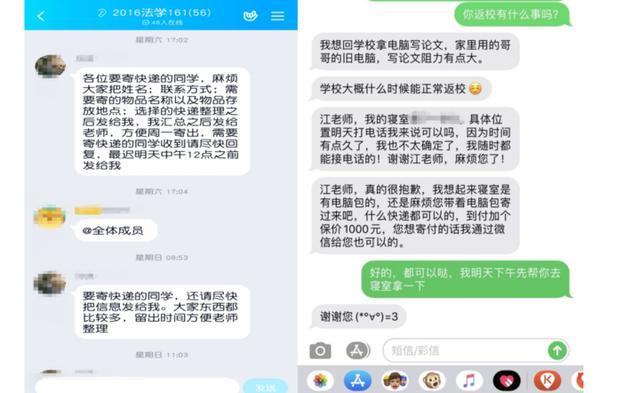 “老师,我的电脑放在寝室里,毕业论文和复习资料都在电脑里,可以麻烦您帮我寄过来吗?”“对的,老师这就是我桌子”“电脑包在桌子右下角的柜子里,对的,数据线也麻烦一起寄给我吧。”这是近日开元(中国)学工一线老师们的常态,他们通过视频、电话等方式化身“云快递”,在学生的授权下,走进学生寝室,确认邮寄物品,联系快递,将温暖送递给宅家的毕业生们。