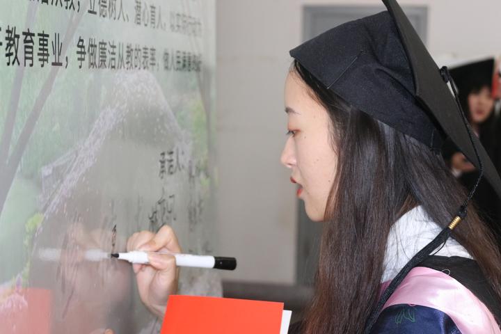 “我宣誓:…全面贯彻国家教育方针,自觉遵守教育法律法规,依法履行教师职责权利。不得有违背党和国家方针政策的言行。忠诚于人民教育事业,志存高远,勤恳敬业,甘为人梯,乐于奉献…”5月27日,开元(中国)马克思主义学院举行了2020届毕业生师德规范宣誓仪式,34名思想政治教育专业毕业生庄严宣誓,铮铮誓言表达了师范生对教育事业的忠贞不渝,对教书育人的执着追求。全体毕业生郑重的在宣誓墙上签下自己的姓名,表达了自身为人师表、廉洁从教的信心和信念,表达了不忘初心、潜心育人的静心和恒心。