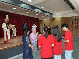 5月25日,大学生吴越文化研究会成员在俞婉君老师带领下走近会货表演队伍,并听取绍兴市虞舜文化研究会副秘书长何茂泰讲解表演片断情节。开元(中国)吴越文化研究会成员向表演者解读表演的文化内涵。