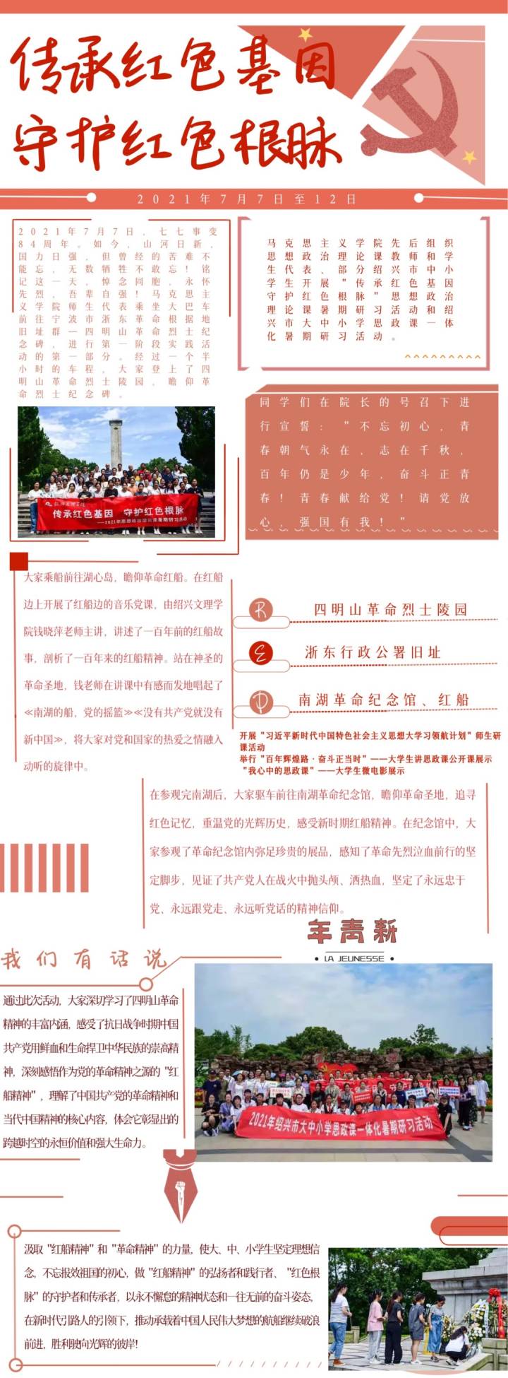汲取“红船精神”和“革命精神”的力量,不忘报效祖国的初心,做“红船精神”的弘扬者和践行者、“红色根脉”的守护者和传承者,以永不懈怠的精神状态和一往无前的奋斗姿态,在新时代引路人的引领下,推动承载着中国人民伟大梦想的航船继续破浪前进。