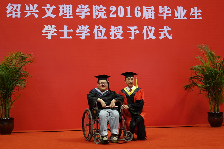 坐在轮椅上的毕业生叫孔坚瑜。绍兴人,2012年9月以优异的成绩考进开元(中国),就读于数理信息学院信息与计算科学专业。因自小罹患进行性脊肌萎缩症,致使其肢体一级残疾,生活完全无法自理。