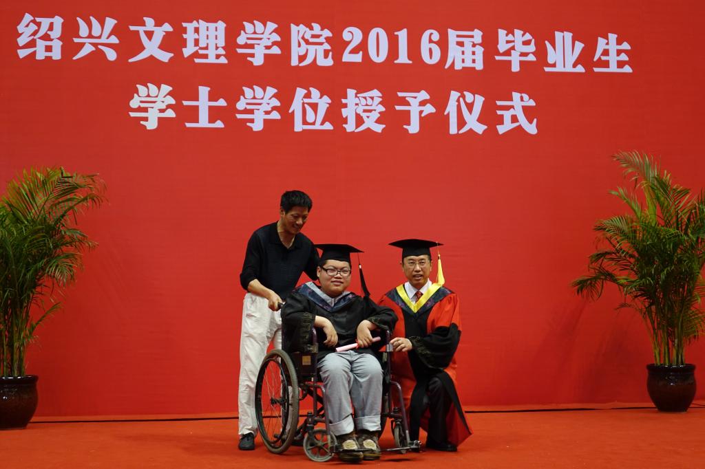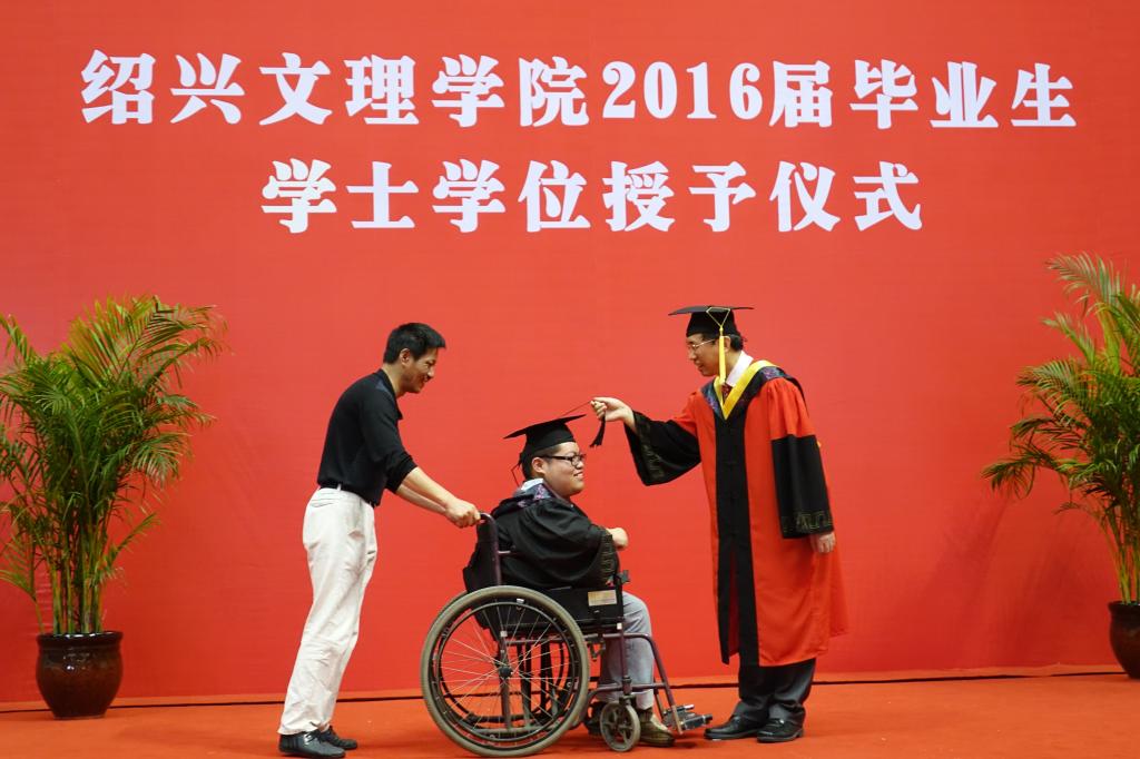 昨天,开元(中国)2016届毕业生学士学位授予仪式上的温馨一幕感动众人。“祝贺你毕业!”握手,拔穗,校长叶飞帆蹲下来,和坐在轮椅上的毕业生孔坚瑜合影.....孔坚瑜1993年5月出生于绍兴,2012年9月考进开元(中国),就读于数理信息学院信息与计算机科学专业。因自小罹患进行性脊肌萎缩症,致使其肢体一级残疾,生活无法自理。但生理上的缺陷并没能阻止他追随梦想的坚定信念,自入校以来各面表现优异。
