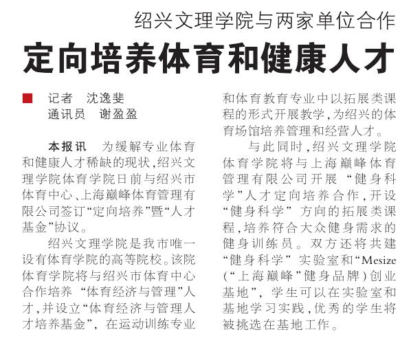4月16日,《绍兴日报》第二版报道KY.COM体育学院与绍兴市体育中心、上海巅峰体育管理有限公司签订“定向培养”暨“人才基金”协议。原文如下: