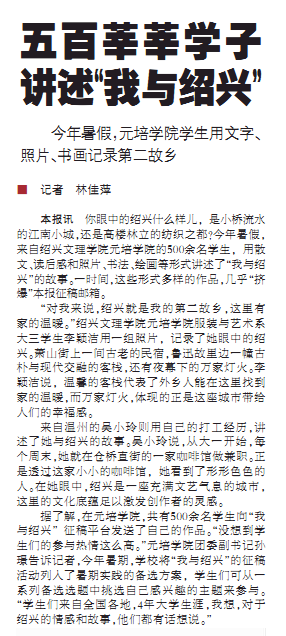近日,《绍兴日报》头版以《五百莘莘学子,讲述“我与绍兴”》为题,报道元培学子暑期通过散文、读后感、照片、书法、绘画等多种形式讲述了“我与绍兴“的故事。