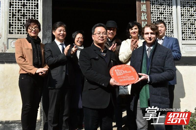 (法国驻沪总领事馆文化领事费保罗(前排右一)授予绍兴鲁迅纪念馆“历史文化名屋”牌匾 首席记者 袁云 摄)